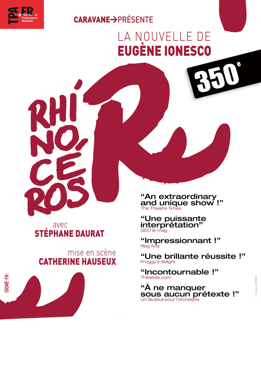 Rhinocéros est une pièce de théâtre écrite par Eugène Ionesco en 1959, emblématique du théâtre de l’absurde. Elle a été créée à Düsseldorf la même année, puis jouée à Paris en 1960 au Théâtre de l’Odéon.